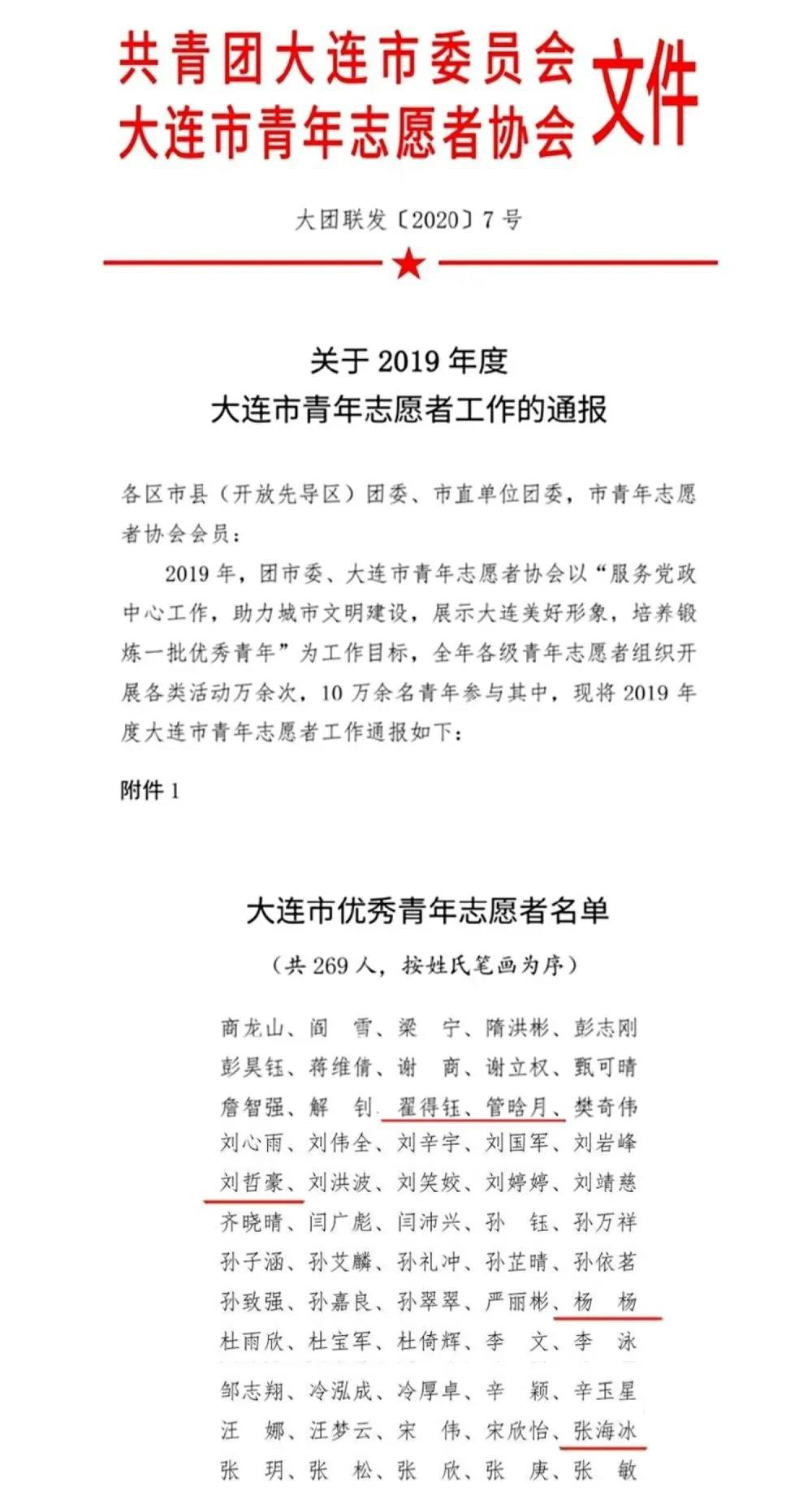 5月11日,共青团大连市委员会、大连市青年志愿者协会对2019年度大连市青年志愿者工作的先进典型进行了通报表扬。此前经校团委审核、组织评选、材料上报,经共青团大连市委员会及大连市青年志愿者协会审核,最终我校杨杨、翟得钰、刘哲豪、管晗月、张海冰五位同学因在抗击疫情的志愿工作中表现优异,荣获大连市优秀青年志愿者称号。