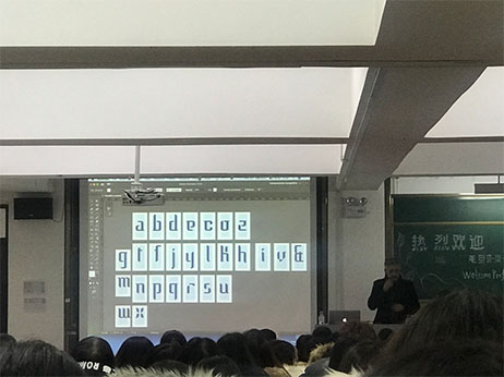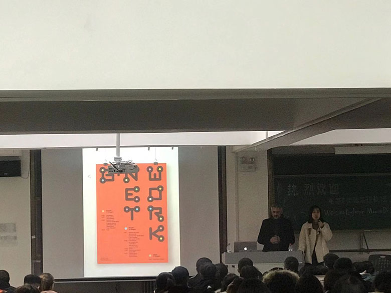 其次,Maurizio Di Lella教授向我系学生介绍了制作过程要想象成一种视觉的表演,要在空的地方寻找填满观念,实际在大屏幕展现了一些成熟的设计作品,给予学生们一些启发和引导,设计不光是对美的一种表达,而且是对意义的表现,让观者能感受到里面的信息。Maurizio Di Lella教授现场使用软件给学生讲解平面设计的学术知识,与本人的设计灵感来源。