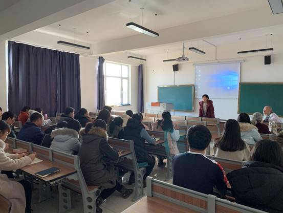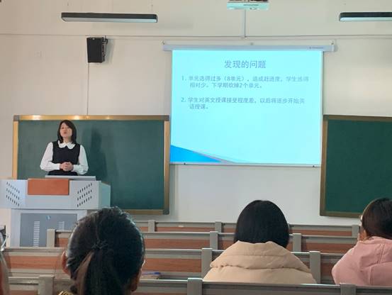 而后,外语系全体老师开展了有关“英语口语教学”的教研活动。第一位发言的是肇启慧老师,她表明口语课上要为同学们准备多种多样的口语对话题材,同时也强调了任课老师口语发音的重要性,因为在课堂上学生会模仿老师的发音。