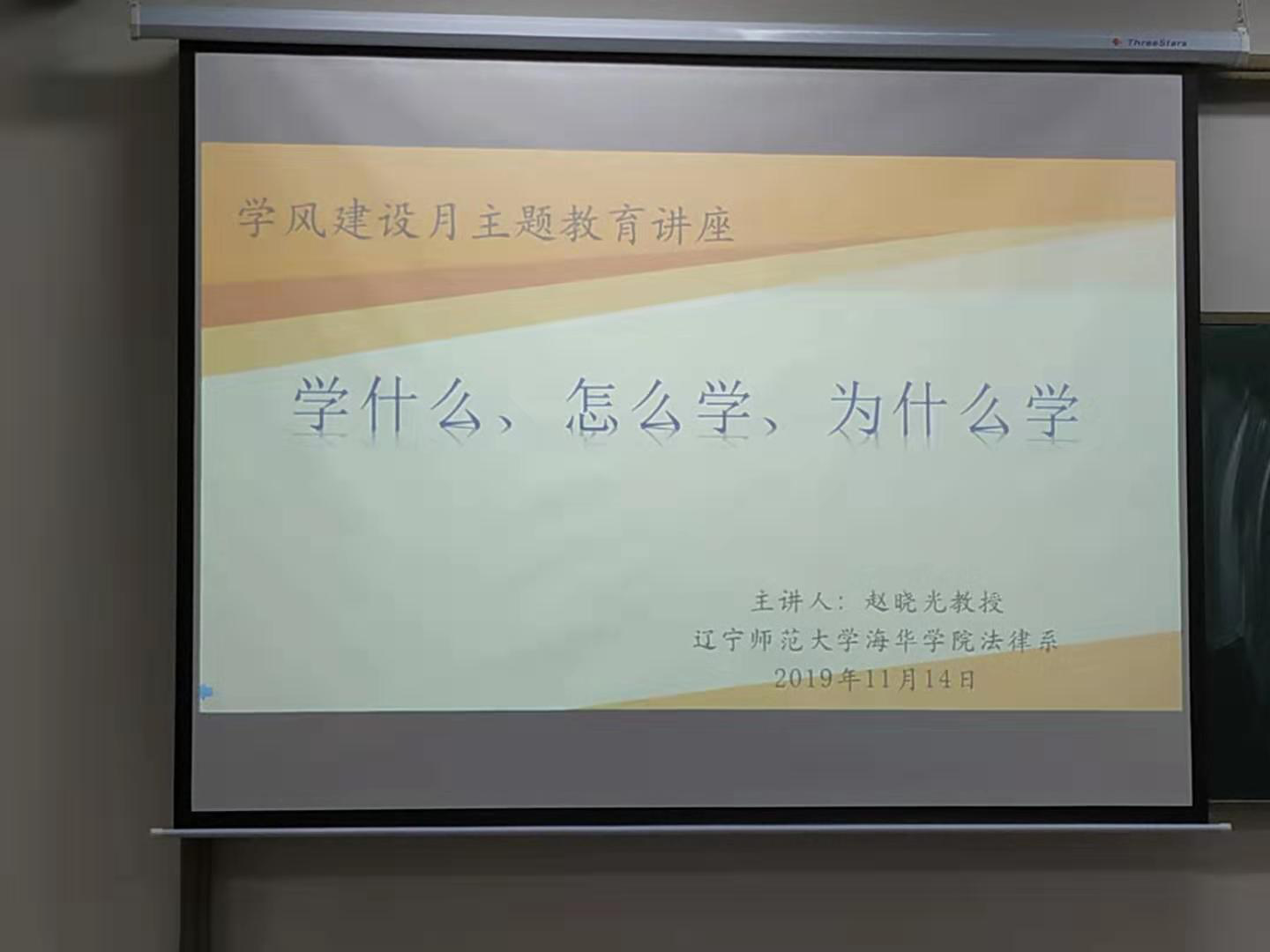 为了进一步加强法律系的学风建设,帮助同学们掌握良好的学习方法,更好地学习专业知识,提高自己的学习效率,法律系于11月14日晚上18:40在厚德楼205教室举办学风建设主题教育讲座。法律系主任赵晓光教授应约为2019级同学做了一场题为“学什么、怎么学、为什么学”的学习专题报告。